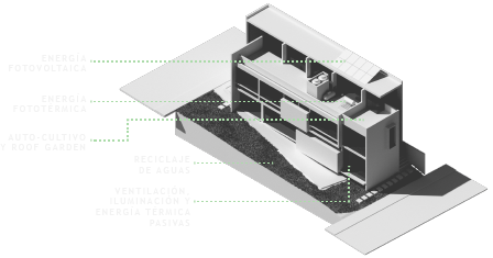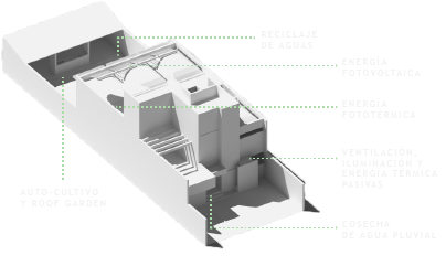 Proyecto habitacional unifamiliar de 310 m2. La materialidad se conforma por dos volúmenes intersectados con una orientación franca al sur, lo que permitió aclimatar los espacios tanto en condiciones de frío como de calor, usando la radiación solar para invierno y el enfriamiento evaporativo para el verano. Trata el 100% de sus aguas con un ahorro del 42%, no se descarga agua a la red pública, puesto que se usa toda en el edificio y áreas verdes.