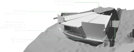 Algunas de las características de este proyecto son: autosuficiencia energética, cosecha y reuso de agua, gestión del 100% de sus residuos orgánicos y la climatización mediante ecotecnologías pasivas. Se desarrolla en un entorno natural protegido y su geometría fluye con la pendiente del terreno. La accesibilidad del proyecto integró a personas con movilidad reducida y debilidad visual a pesar de ubicarse en un entorno con pendientes pronunciadas.